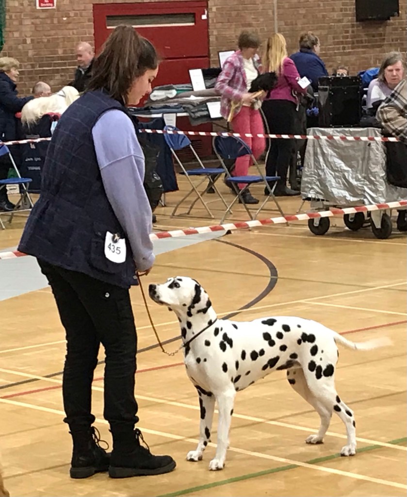 1st Wallington’s Ailsadot Astral Lyra, 10 month old black spotted bitch with lovely dark pigmentation and pretty expression. She was full of beans today, loving every minute, but certainly not phased at all. Lovely feminine head and nice long neck down to well defined withers. Good level top line which she carried well on the move. Nice angulation front and rear with good bend of stifle and tight cat feet. Nice rythmic movement when she settled. Best Puppy in breed.