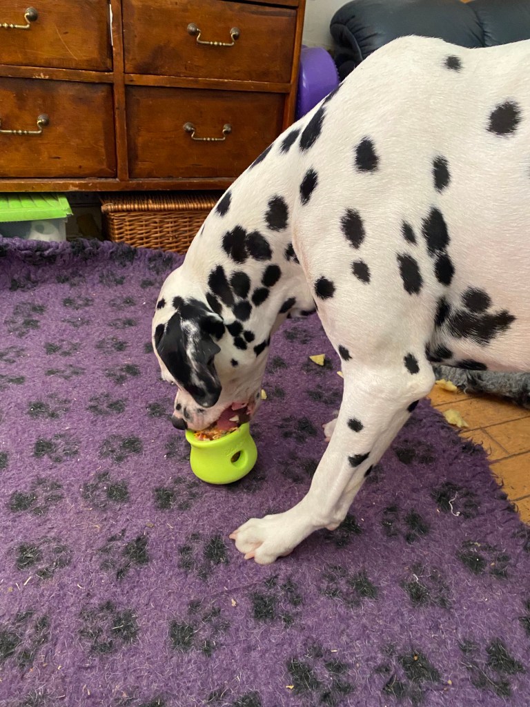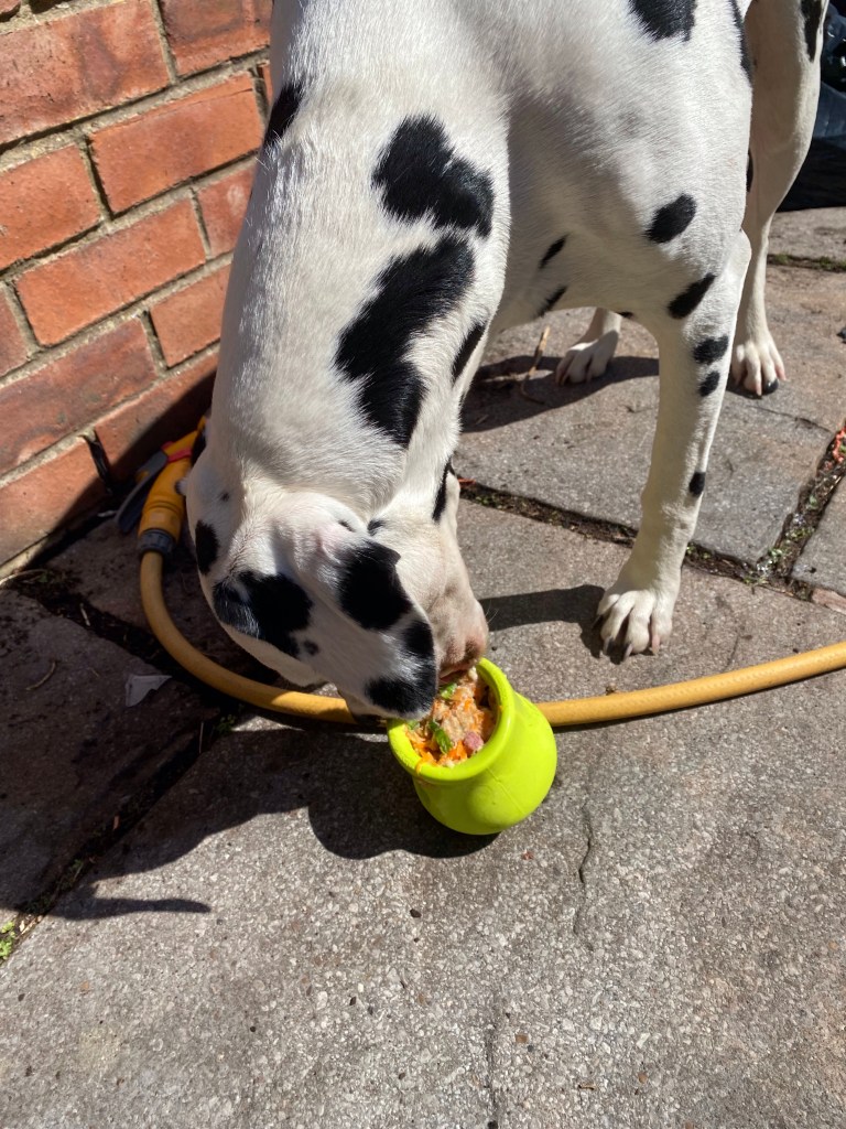 After spending the morning snoozing off their exercise, the Spots had frozen Toppls for lunch, a way of keeping cool and having a different type of exercise in this very hot weather. Licking and chewing activities are calming and tiring activities, so perfect for hot days when they can’t get out as much.
