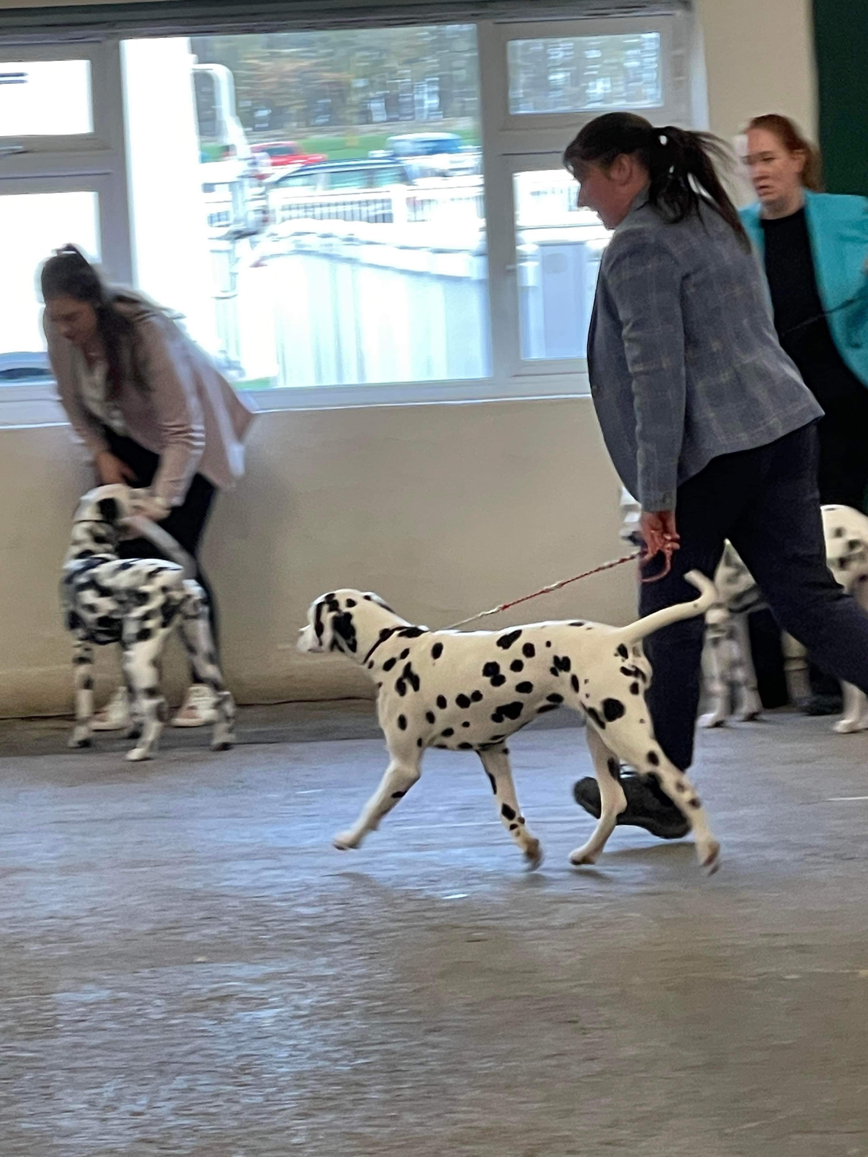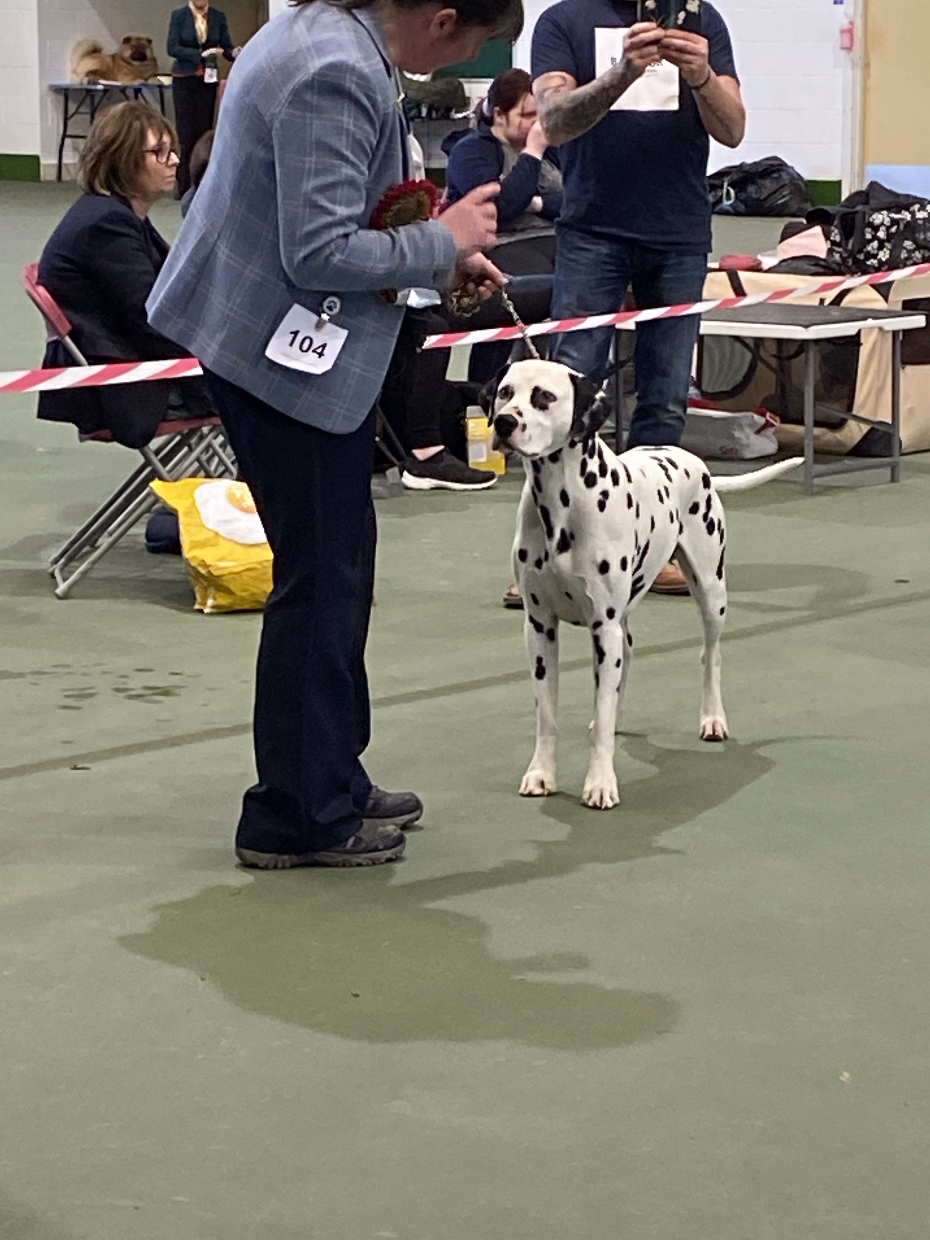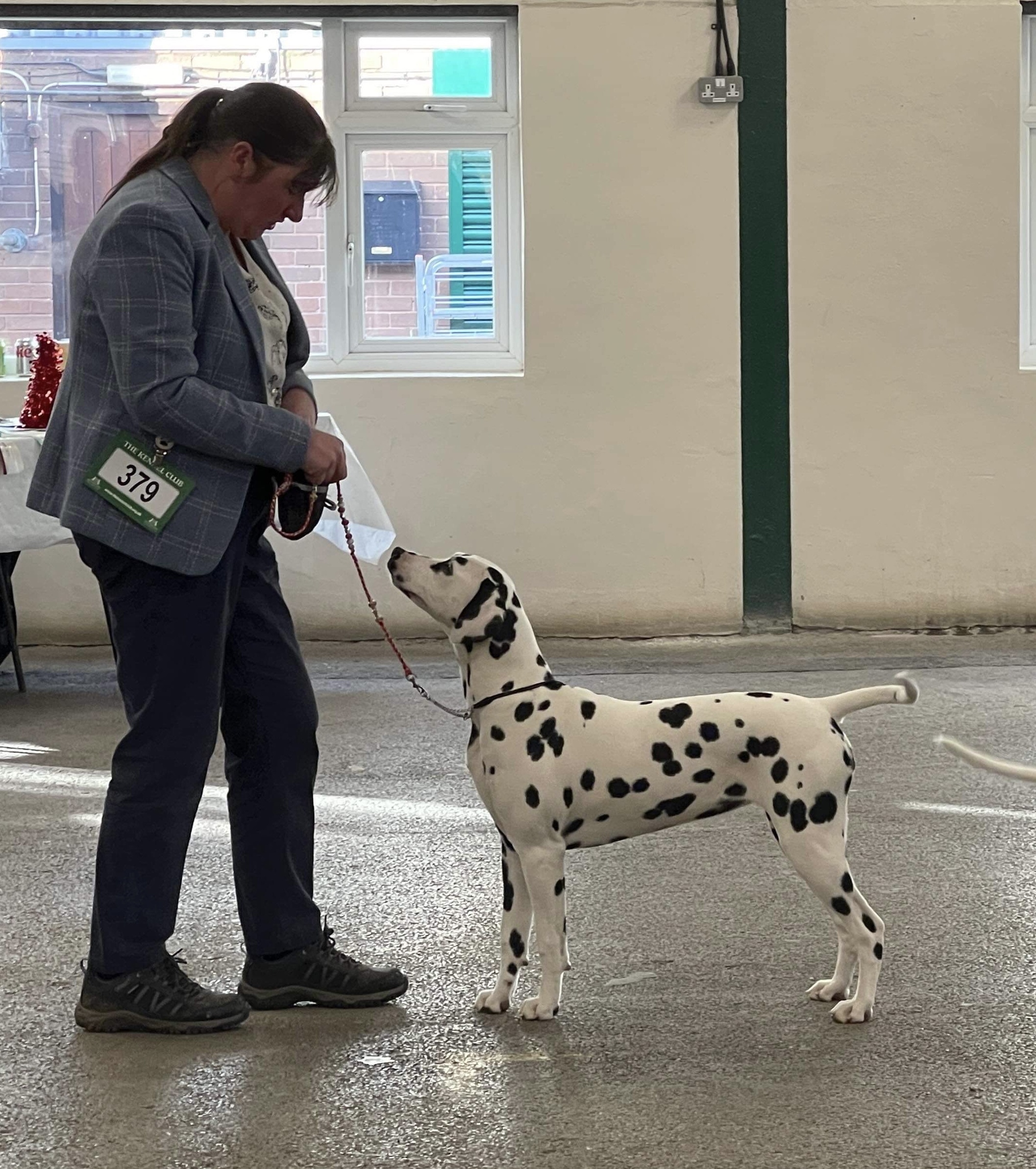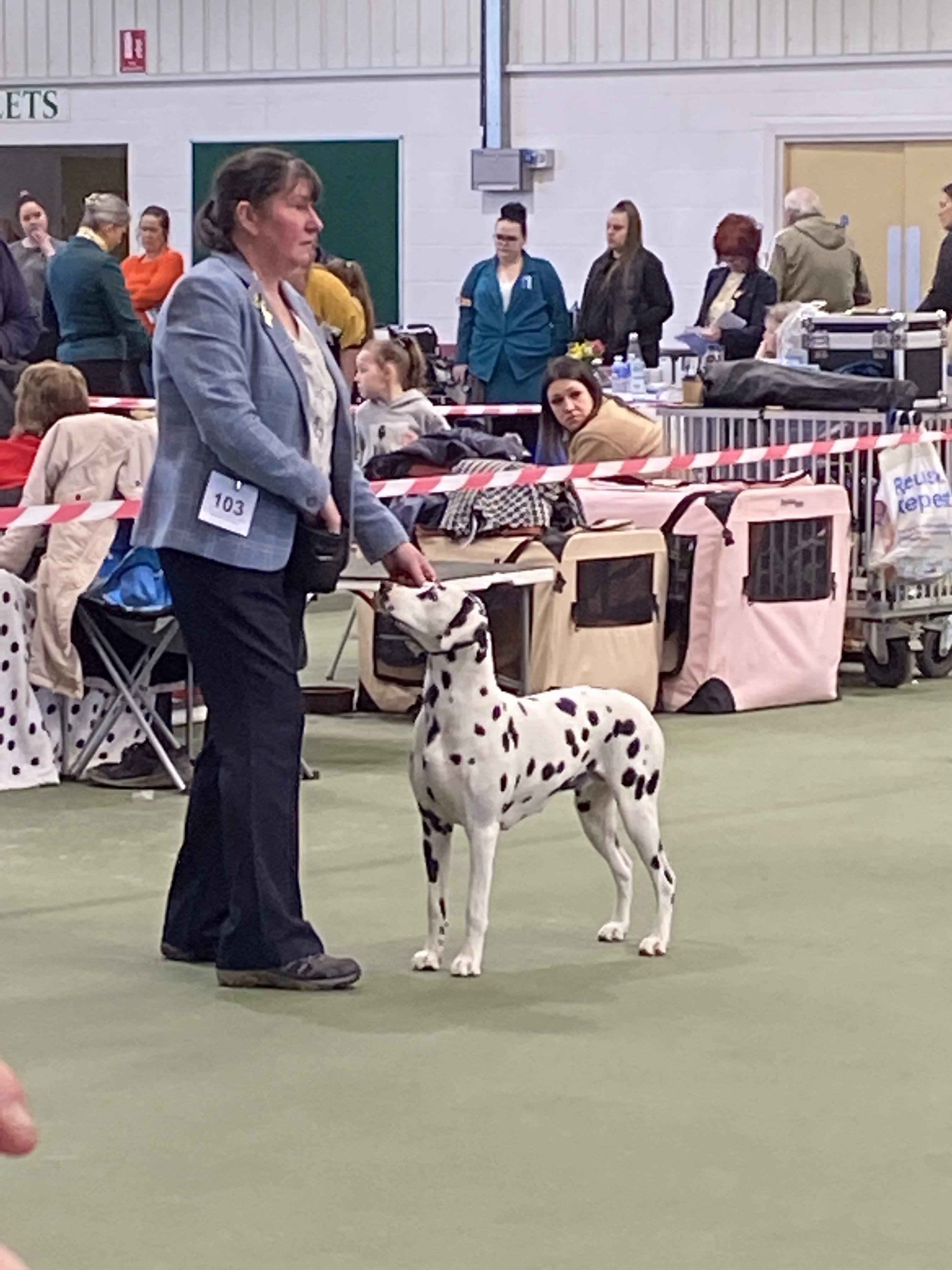 1, Sophtspot In The Zone. Outstanding 5 year old black spotted male, for me he ticks all the boxes, everything about him says quality. Handsome head, lovely dark eye and kind expression. He holds his ears well and he has a correct scissor bite. Plenty of substance, well muscled throughout, clearly showing he is male but not coarse in any way. Good length of neck into laid back shoulders and well defined withers. Ribs well sprung, deep chest, strong loin, level topline held on the move and his tail is set and held nicely. Elbows are tight to his chest, straight front legs, slight spring in pasterns down to tight cat feet. His ideally balanced front and rear are put to use as he shows off his smooth rhythmic movement which looked effortless. His coat is the icing on the cake, dark black well placed spots, on a clear white background. Presented in excellent coat and condition. Handled well. BOB
