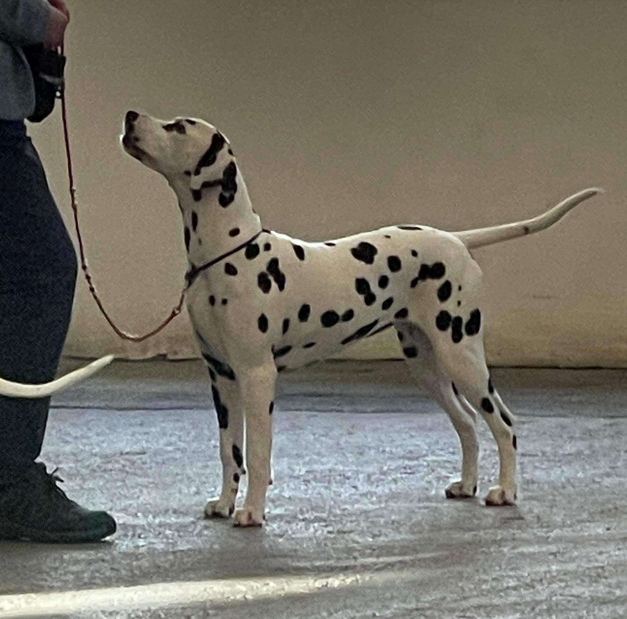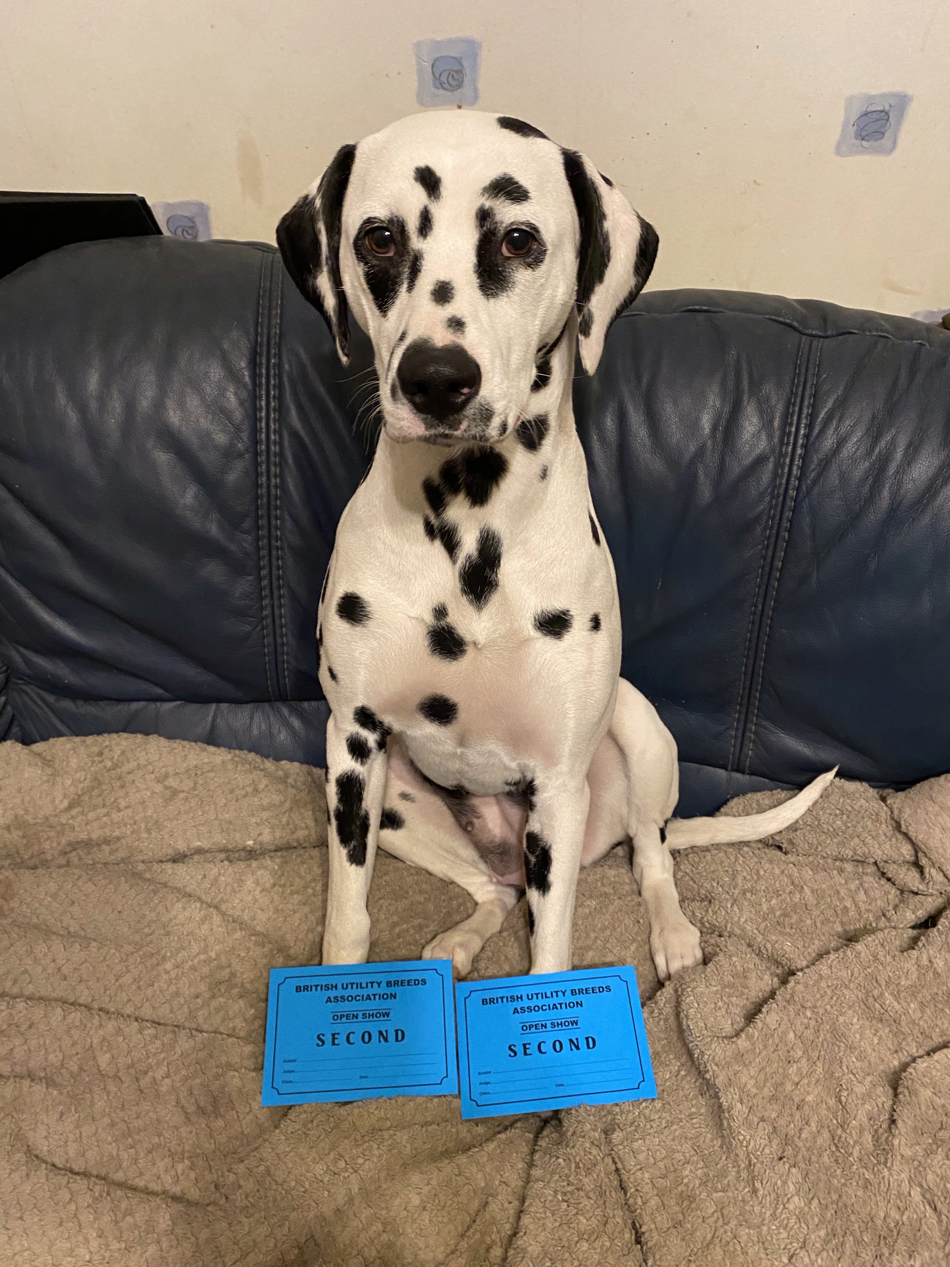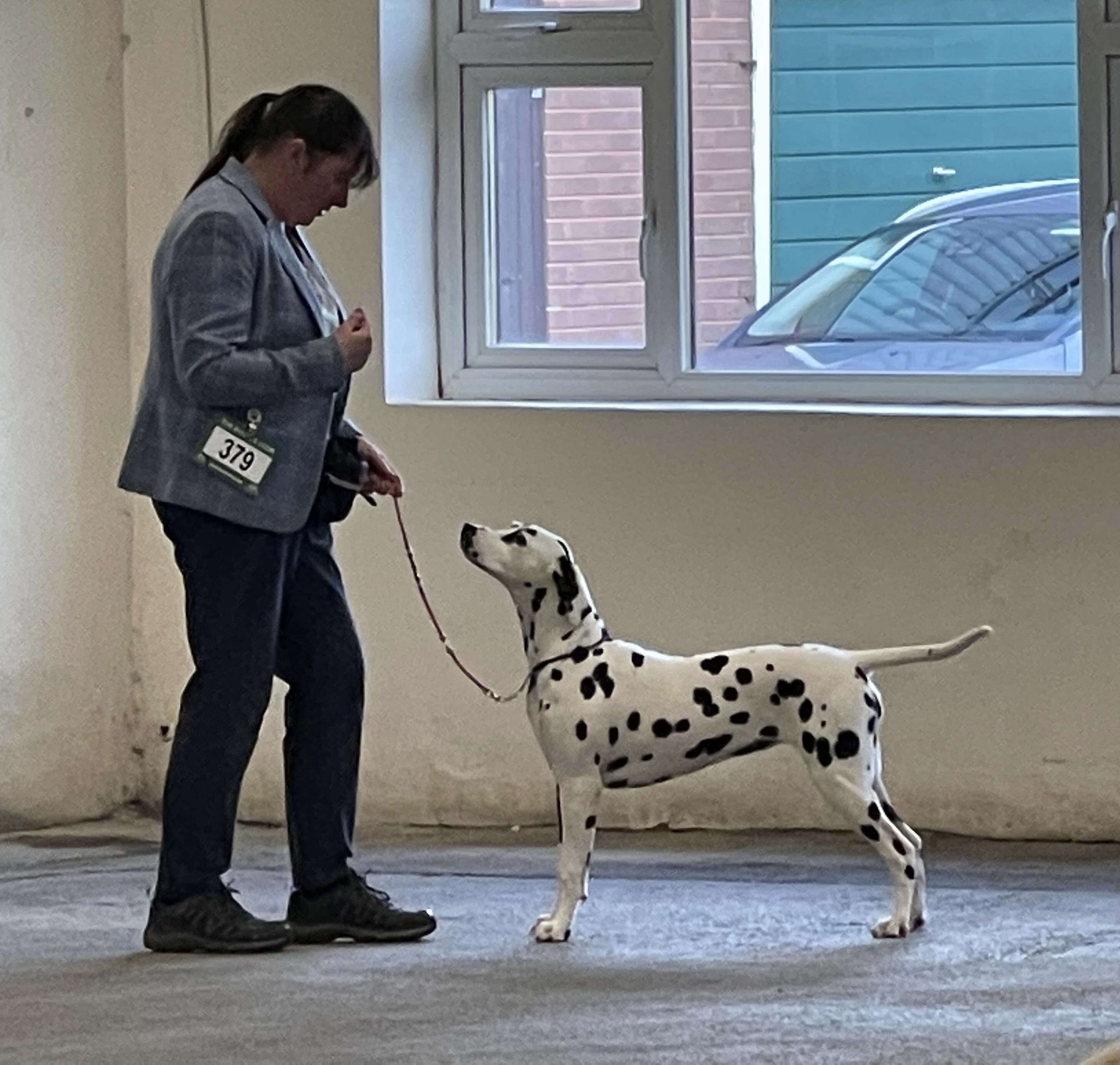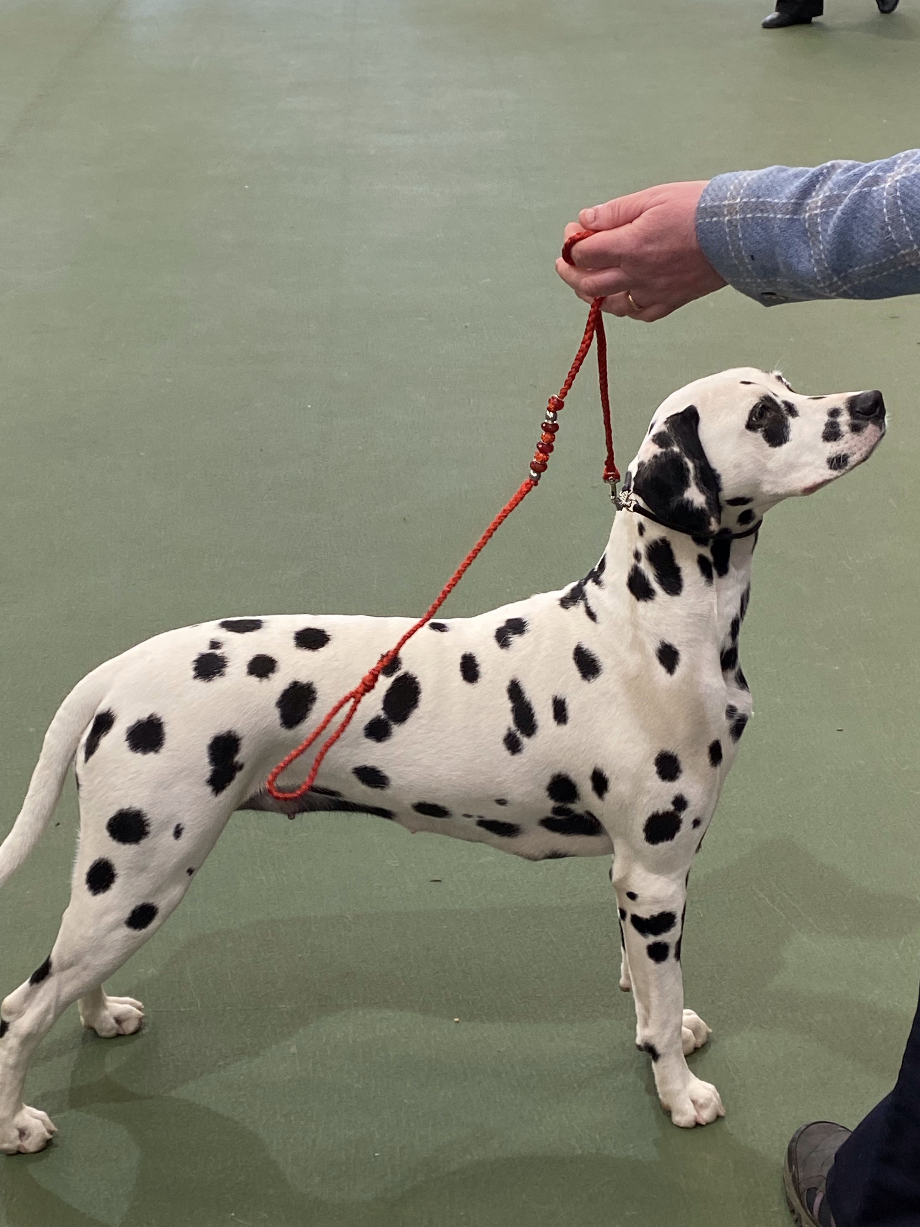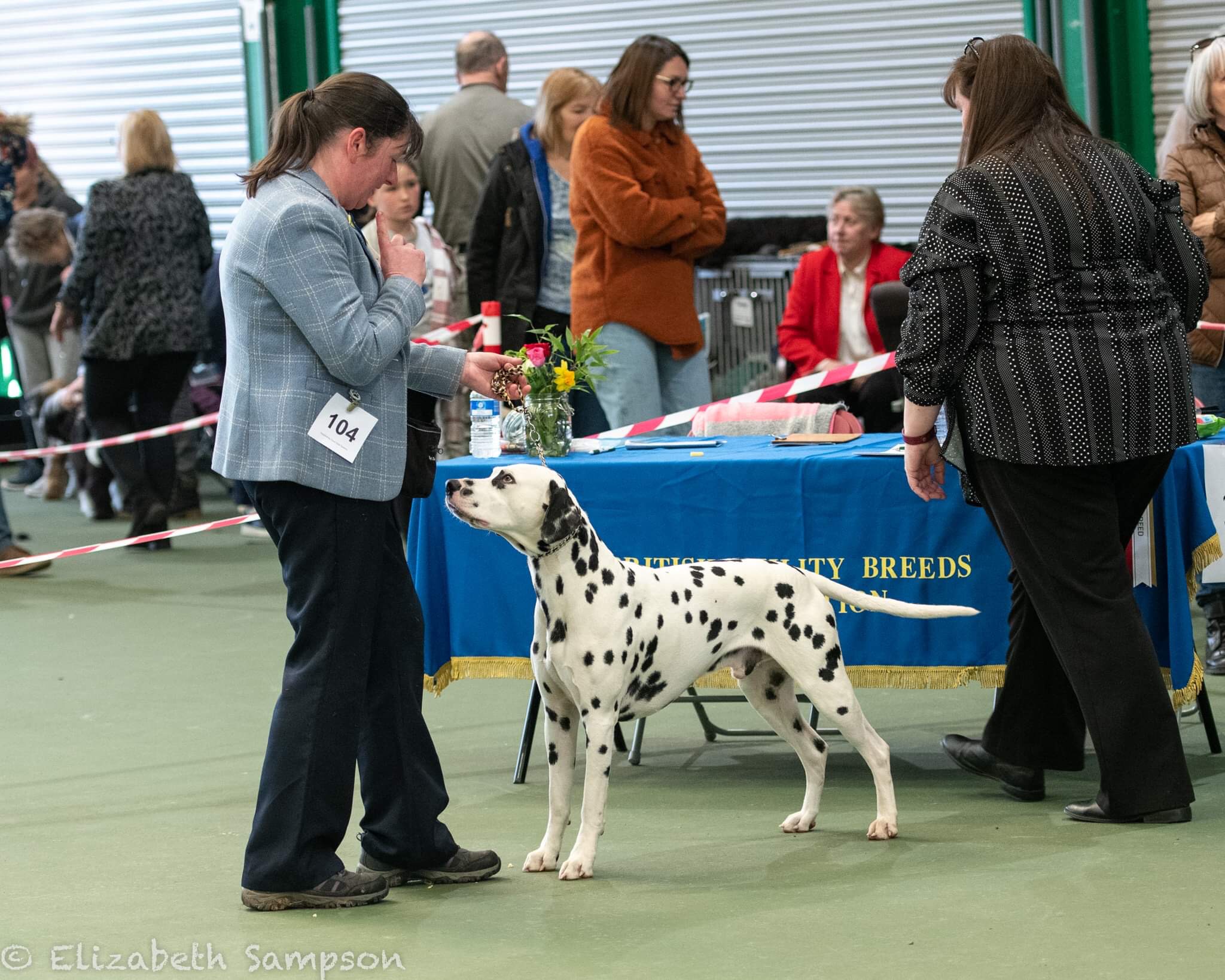1, Sophtspot In The Zone. Outstanding 5 year old black spotted male, for me he ticks all the boxes, everything about him says quality. Handsome head, lovely dark eye and kind expression. He holds his ears well and he has a correct scissor bite. Plenty of substance, well muscled throughout, clearly showing he is male but not coarse in any way. Good length of neck into laid back shoulders and well defined withers. Ribs well sprung, deep chest, strong loin, level topline held on the move and his tail is set and held nicely. Elbows are tight to his chest, straight front legs, slight spring in pasterns down to tight cat feet. His ideally balanced front and rear are put to use as he shows off his smooth rhythmic movement which looked effortless. His coat is the icing on the cake, dark black well placed spots, on a clear white background. Presented in excellent coat and condition. Handled well. BOB