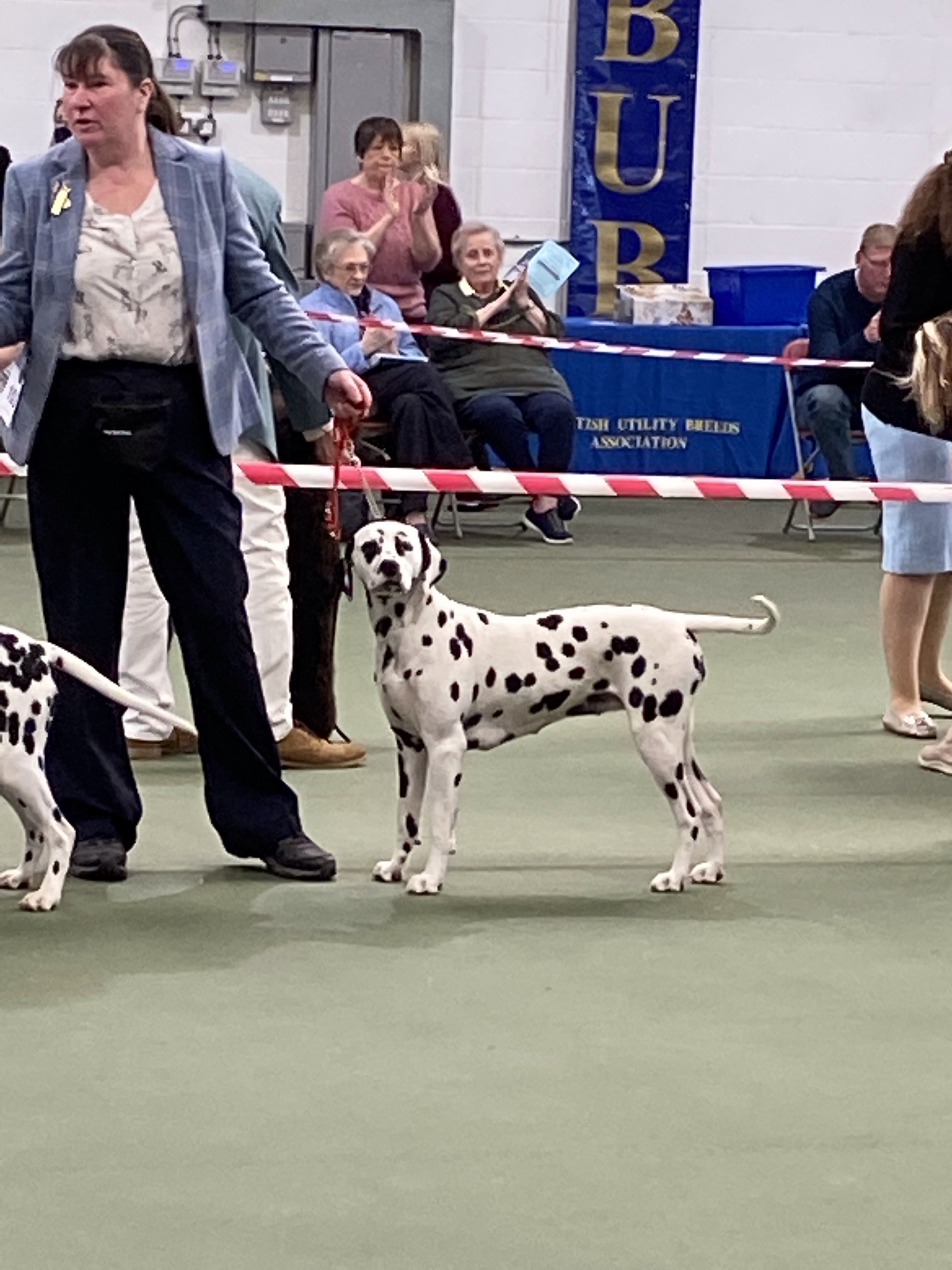 1st Wallington’s Ailsadot Astral Lyra, 10 month old black spotted bitch with lovely dark pigmentation and pretty expression. She was full of beans today, loving every minute, but certainly not phased at all. Lovely feminine head and nice long neck down to well defined withers. Good level top line which she carried well on the move. Nice angulation front and rear with good bend of stifle and tight cat feet. Nice rythmic movement when she settled. Best Puppy in breed.